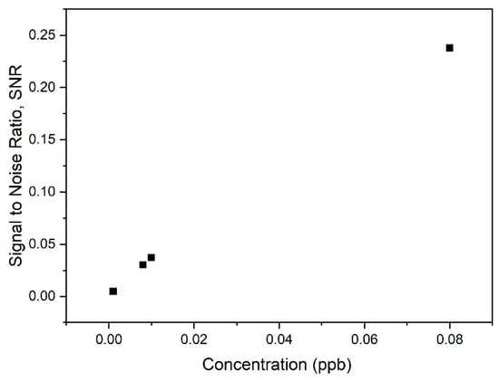 From the data obtained for SNR values using Equation (4), the evolution of SNR with increasing carbaryl concentration was plotted. As illustrated in Figure 17, increasing the carbaryl concentration appeared to reduce the noise in the SPR signal, resulting in higher SNR values for the suggested sensor.