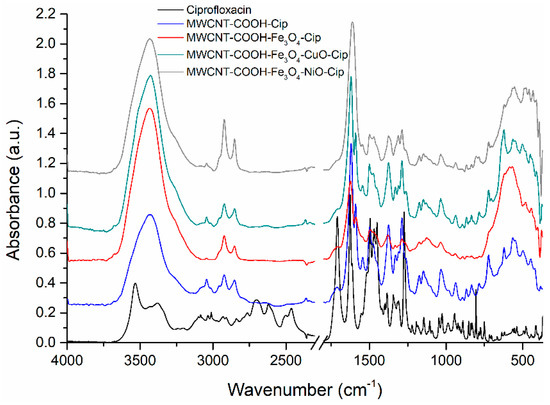 Following functionalization of the nanocomposites with ciprofloxacin, the characteristic absorption bands can be identified on the spectra in the case of all four types of nanotubes; however, some of them are slightly shifted as follows: 3285 cm−1 (-OH), 1707 cm−1 (–COOH), 1625 cm−1 (–C=O), 1493 cm−1, 1467 cm−1 (-C-H), 1449 cm−1 (–C-O ), 1383 cm−1 (-C=C aromatic), and 1271 cm−1 (-C-F) [42,43], which provides evidence of its presence on the surface of the nanotubes exposed to the treatment (Figure 2, Figure 3 and Figure 4). The displacement of some vibration bands and a change in intensity and broadening of the absorption bands from 1707, 1625, 1383, and 1271 cm−1 can be observed. The displacement of the bands and their broadening was most pronounced for the MWCNT–COOH/Fe3O4/Cip and MWCNT–COOH/Fe3O4/NiO/Cip samples.