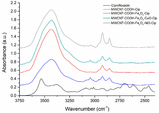 Comparison of the FTIR spectra of ciprofloxacin, MWCNT-COOH/Cip, MWCNT-COOH/Fe3O4/Cip, MWCNT-COOH/Fe3O4/CuO/Cip, and MWCNT-COOH/Fe3O4/NiO/Cip, with a 3750–2250 cm−1 spectral domain.
