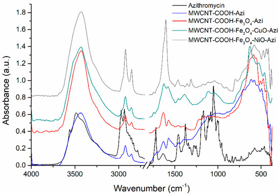 Comparison of the FTIR spectra of azithromycin, MWCNT-COOH/Azi, MWCNT-COOH/Fe3O4/Azi, MWCNT-COOH/Fe3O4/CuO/Azi, and MWCNT-COOH/Fe3O4/NiO/Azi, with a 4000–370 cm−1 spectral domain.
