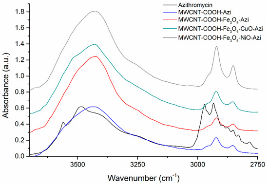 Comparison of the FTIR spectra of azithromycin, MWCNT-COOH/Azi, MWCNT-COOH/Fe3O4/Azi, MWCNT-COOH/Fe3O4/CuO/Azi, and MWCNT-COOH/Fe3O4/NiO/Azi, with a 3750–2700 cm−1 spectral domain.