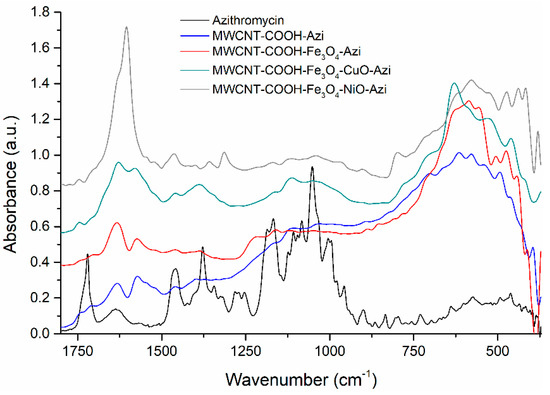 Comparison of the FTIR spectra of azithromycin, MWCNT-COOH/Azi, MWCNT-COOH/Fe3O4/Azi, MWCNT-COOH/Fe3O4/CuO/Azi, and MWCNT-COOH/Fe3O4/NiO/Azi, with a 1800–370 cm−1 spectral domain.