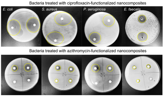 Antibacterial effects of the obtained nanocomposites functionalized with azithromycin (Azi) and ciprofloxacin (Cip) (values expressed in mm ± standard deviation).