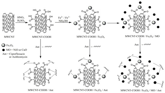 The decoration of CNTs with metal nanoparticles (NPs) has been demonstrated to have potential applications as a new hybrid material regarding an increase in electrical conductivity and gas sensors [8,9]. Carbon nanotubes (CNTs), due to their ultra-high surface area, have a high mechanical strength but are ultra-light in weight and have excellent chemical and thermal stability, which are considered ideal properties for drug delivery; however, to improve these properties, metal or metal oxide (MO) nanoparticles with magnetic properties can be attached to the surface of CNTs. Referring to previous studies, CNT composites with metal and metal oxide (MO) NPs exhibited excellent antimicrobial activities [10,11,12]. The antibacterial properties of the MO NPs have been advantageous because of their nano-aspect and broad surface area to volume ratio, which increases direct interactions with microbial membranes [13]. The mechanism of MO NPs as antibacterial agents is not only dependent on the chemical composition, but also on the size, shape, agglomeration degree, solubility, and surface charge of the NPs [14]. One such example is the complex with Fe3O4; by combining the mechanical, electrical, and thermo-optical properties with the superparamagnetic behavior of Fe3O4, a high strength magnetic material can be produced for use in applications in medicine, electrical devices, magnetic data storage systems, and as heterogeneous catalysts. Magnetic nanoparticles also have the advantage that they can be recovered and reused. Hussain et al. demonstrated that the ZnO composite of CNTs showed more antibacterial potential as compared to ZnO NPs. The antibacterial activity of the combination CNTs/ZnO composite was more efficient against Bacillus cereus (B. cereus), Escherichia coli (E. coli), and Pseudomonas aeruginosa (P. aeruginosa), as compared to the ZnO NPs [15]. Another study combined CNTs and other nanocomposites (e.g., cellulose (cotton) nanocomposite) with silver NPs to obtain nanomaterials that demonstrated increased antibacterial activity against two strains of infectious Gram-negative bacteria (E. coli) and Gram-positive (Staphylococcus aureus—S. aureus) [16,17]. More recently, the antimicrobial properties of CuO NPs have been studied, which demonstrated exceptional bactericidal and fungicidal activity [18,19].