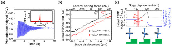 Three-step calibration procedure. At first, the free vibration of the magnetically levitated spring was recorded (a) to determine the resonant angular frequency by FFT (a inset). The lateral force acting on the probe was calibrated by the magnetic spring (b). Finally, the lateral (torsional) spring constant of the cantilever was evaluated by scanning a rigid rectangular step (c).