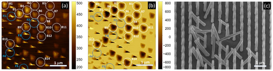 Lateral (a) and normal (b) PSPD signal maps taken upon the constant height scanning of the nanowires and tilt-view SEM image (c) taken on the same area after the scanning. Trapezoidal patterns in (a,b) show the sites where NWs remained unharmed (white circles), while triangles indicate fracture of the NWs (blue circles). Fourteen signal lines were selected to evaluate elastic NW bending (B1–B14) and five further ones to investigate the fracture (F1–F5).