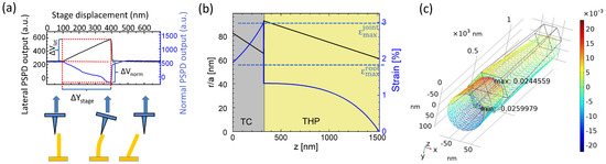 Bending curves of NW F2 taken in the scanning line of the fracture event (a). Calculated maximal strain at the surface from bottom to the top of the NW along the z-axis at changing radius (b). Comsol simulation of volumetric strain (c). The maximal value was located near to the interface of TC–THP segments.