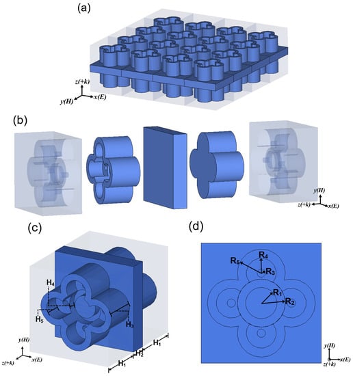 As illustrated in Figure 1a,b, there are five layers in the structure unit of the MA: resin layer, flower-shaped water layer, full water layer, flower-shaped water layer and resin layer. The permittivity of the resin is 3.0, and the tangent loss is 0.001; the permittivity of water follows the Debye equation in Equation (1). In Figure 1c, the height of the resin layer, full water layer and flower-shaped water layer are H1, H2 and H3, respectively. The flower-shaped water layer has four round petals and a cylindrical flower center, and each petal has a round terrace with round holes and the height of the flower center and the round terrace is H4. The height of the round terrace from the petal edge is H5. From Figure 1d, there are five different circles in the flower and their radii are R1, R2, R3, R4 and R5. The final structural dimensions of the unit structure are displayed in Table 1.