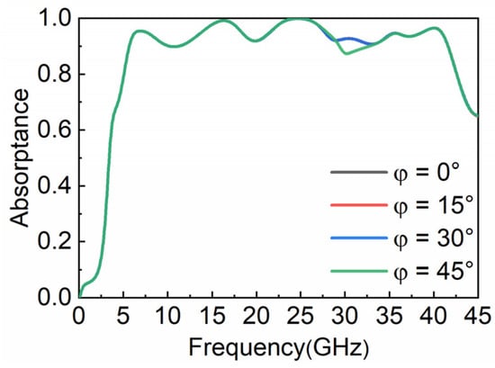 The polarization characteristic of the proposed MA is illustrated in Figure 3. We simulate the absorptance at vertical incidence with different polarization angles. When the polarization angle increases in the range of 0–45°, the absorptive curves of the water-based MA coincide completely, showing that the designed absorber has good polarization insensitivity, because it has a C4 structure.
