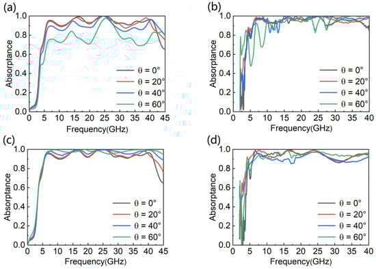 To further clarify the absorptive performance of the MA, we simulate the absorptance of it in different polarization modes and at different oblique incident angles. When the incident angle gradually changes in 0–60°, and the EM wave is in TE polarization mode, the absorber can keep absorptance above 0.8 between 0° and 40°, and the bandwidth is unchanged in Figure 4a. Even when the angle of incidence reaches 60°, the absorptance can still be above 0.7 and the highest absorptance can reach 0.9. As displayed in Figure 4b, experimental results are basically in agreement with the simulations. Even at 60°, the experimental absorptance is higher than the simulated absorptance. In Figure 4c, when the angle of incidence gradually increases from 0° to 60° and the EM wave is in TM polarization mode, the absorber still can keep the absorptance above 0.9, and the bandwidth increases with the angle of oblique incidence increasing from 0° to 60°. As displayed in Figure 4d, the experimental results are well consistent with the simulations. This shows that the absorptive performance of the designed MA in the TM polarization mode is greater compared with the TE polarization mode. Additionally, the above proves that the proposed MA has great characteristics of the wide incident angle, whether in TE mode or TM mode.