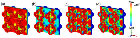 Moreover, we monitor the power loss density and energy density of the electric and magnetic field of the water layer at four resonance points to better explain the internal loss of the MA. The all-dielectric water-based bi-directional MA is completely symmetrical about the x-y plane, so we only discuss the distribution of power loss density when the EM wave is vertically incident along the −z direction. Because some previous water-based MAs have proved that the power loss is mostly accumulated in the water layer of the WB absorber [], we only monitor the power loss density of the water layer here. Whether it is low frequency or high frequency, the water layer between the two flower-shaped structures with mirror symmetry loses most of the energy at these four resonance points. It can be found from Figure 5a that the flower-shaped structure on the back has energy loss at 6.86 GHz. Therefore, the absorber is designed to be relatively thick in order to consider the energy absorption of the lower frequency part. From Figure 5b to Figure 5d, it is indicated that with the increase in frequency, the flower-shaped structure plays an increasingly significant role in energy loss in the designed MA.