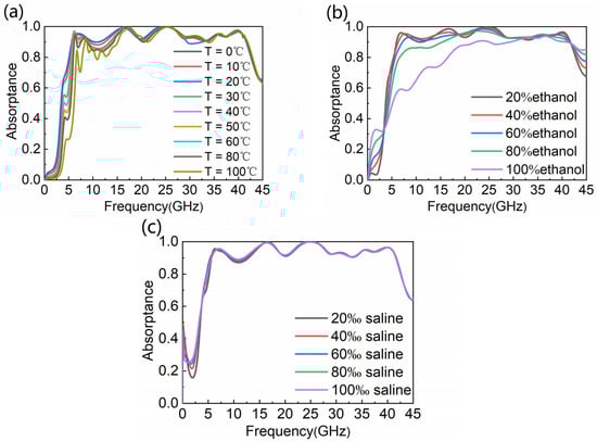 Because temperature has an influence on the dielectric constant of water, it is essential to consider the absorptive performance of the WB absorber when it is injected with water at different temperatures. As seen in Figure 8a, with the temperature increasing from 0 °C to 100 °C, the absorptance of the absorber changes only slightly. When the temperature is below 80 °C, the absorber has good thermal stability in the working frequency range. In Figure 8b,c, we also simulate the absorptance of ethanol and saline with different concentrations, which shows that our water-based absorber has high tolerance to liquid, and further expands the application scenario of the absorber.