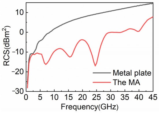 In order to focus on the application of the absorber, we simulate the radar cross-section (RCS) of the absorber with 10 × 10 units and the metal plate with the same area, and we monitor the scattering modes at four resonance points. As seen in Figure 9, when the absorber compares to the metal plate, the RCS reduction effect of the MA is better than that of metal plate. The reduction effect is particularly obvious in 5.7–41.6 GHz, and the maximum reduction reaches 26 dB. In Figure 10, we compare the scattering amplitudes of the absorber and the metal plate at four resonance points. Comparing the scattering modes of the absorber and metal plate at the same frequency point, the water-based MA designed by us significantly reduces the scattering amplitude in all directions in space, especially in the incident direction. Moreover, the higher the absorptance, the better the reduction effect of RCS.