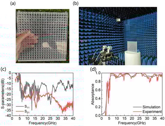 (a) Experimental sample; (b) experimental environment; (c) measured S11 and S21; (d) absorptance of simulation and experiment.