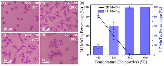 - Cheng, S.; Yang, L.; Li, J.; Liu, Z.; Zhang, W.; Chang, H. Large Area, Phase-Controlled Growth of Few-Layer, Two-Dimensional MoTe2 and Lateral 1T′-2H Heterostructures by Chemical Vapor Deposition. CrystEngComm 2017, 19, 1045–1051. [Google Scholar] [CrossRef]