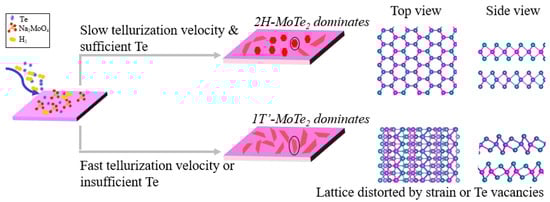 - Yang, L.; Zhang, W.; Li, J.; Cheng, S.; Xie, Z.; Chang, H. Tellurization Velocity-Dependent Metallic-Semiconducting-Metallic Phase Evolution in Chemical Vapor Deposition Growth of Large-Area, Few-Layer MoTe2. ACS Nano 2017, 11, 1964–1972. [Google Scholar] [CrossRef]