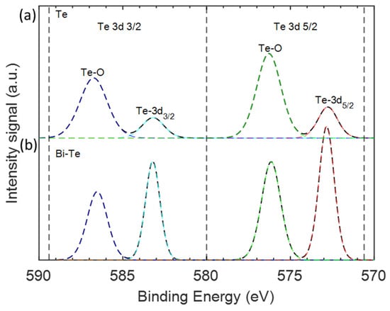 High-resolution XPS core-level spectra of (a) Te-C3, and (b) Bi-assisted Te-C3 (Bi-Te-C3). The coloured dashed lines indicate their individual contribution after deconvolution of the XPS spectra.