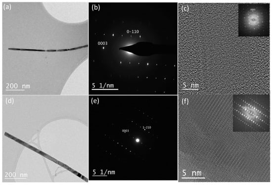 A detailed structural characterization of the growth direction of Te nanowires was performed using HRTEM and SAED. Both samples Te-C3 and Bi-Te-C3 were investigated, and the results are shown in Figure 7. Electron diffraction studies (Figure 7b,e) revealed the single crystalline nature of the nanowire, seen in Figure 7a,d. The SAED pattern in Figure 7b can be indexed as (100) zone axis of trigonal Te and Figure 7e as (210) zone axis, and the growth direction of the nanowire is along the (0001) in both cases. From the SAED patterns, we can conclude that there is no significant variation in the d-spacing along the [0001] direction for both Te-C3 and Bi-Te-C3 samples, where both samples exhibit a similar d-spacing of 0.59 nm. For comparison, the lattice parameter along the [0001] direction of trigonal Te is 0.596 nm [27,33]. The HRTEM images in Figure 7c,f also show the highly crystalline nature and the FFT (Fast Fourier Transform) agrees with the SAED studies. From these results, we conclude that both Te-C3 and Bi-Te-C3 samples are highly crystalline nanowires.