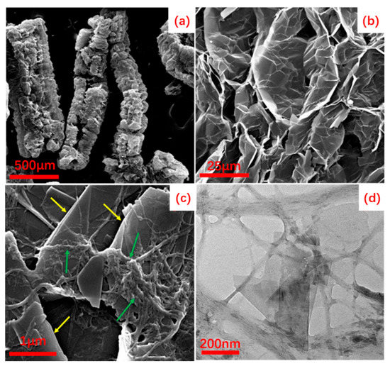 (a,b) SEM images of EG; (c) SEM image of CNFs-FLG; (d) TEM image of CNFs-FLG. The green and yellow arrows indicate CNFs and FLG, respectively.