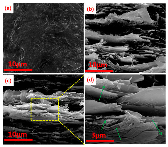 (a) SEM image of the cross section of PEO/CNF-FLG 0%; (b) SEM image of the cross section of PEO/CNF-FLG 50%; (c) SEM image of the cross section of PEO/CNF-FLG 80%; (d) SEM image of the cross section of PEO/CNF-FLG 80% at high magnification. The green arrows indicate CNFs.