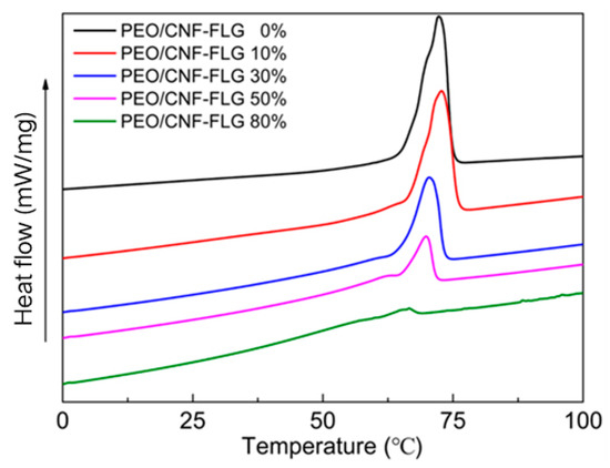 The DSC curves of the PEO/CNFs-FLG composites with different CNFs-FLG filler content are shown in Figure 4. The melting point (Tm), melting enthalpy (ΔHf) and crystallinity (X) were calculated, and the results are provided in Table 2. The melting point of the pure PEO was 72.3 °C, and its crystallinity was 84.6%. With the increase in CNFs-FLG content, both the melting point and the crystallinity of PEO decreased. This is because the CNFs-FLG hybrid fillers were dispersed in the PEO matrix and a large proportion of the -OH on the CNFs and of the -OH and -COOH on the FLG could form strong interfacial bonding with the oxygen-containing groups of the PEO through hydrogen bonding. This hindered the ordered arrangement of PEO molecular chains in the crystallization process [43], resulting in the decrease in crystallinity.