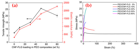 (a) Tensile strength and Young’s modulus of PEO/CNFs-FLG nanocomposite films; (b) Stress-strain curves of PEO/CNFs-FLG nanocomposite films.