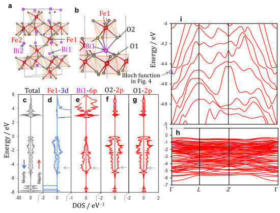 Crystal structures (a,b), electronic density of states (DOS) (c–g), and band structures (of the majority spin band) in the valence band (h,i) of the rhombohedral BiFeO3 (x = 0). The wavefunction of the band shown in blue circle in (i) is displayed in Figure 4. The up (red) and down (blue) arrows in (c) denote the majority and minority spin bands, respectively. The horizontal arrows (gray) in (c–g) correspond to the energy level of the blue circle in (i).