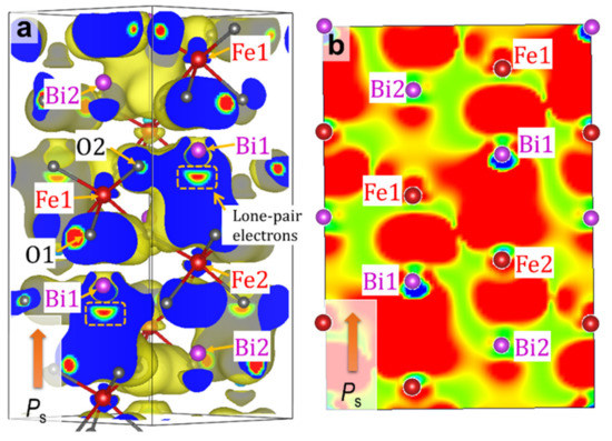 In the paraelectric orthorhombic cells at x ≤ 1/2, the first and second shortest Bi–Fe lengths are ~ 0.32 nm and ~ 0.33 nm, respectively, which are comparable to those in the rhombohedral cells. Actually, the Bloch function resulting from the Fe_3d–O_2p–Bi_6p mixture is extended throughout the crystal at x = 1/2 (see Figure 7). The most significant difference between the ferroelectric and paraelectric cells appears in an accommodation mode of stereo-active lone pair electrons of Bi [26,55,56] (derived from the mixture of Bi_6s–6p), which is the second factor that dominates the presence or absence of Ps. For the ferroelectrics in the rhombohedral (Figure 4a) and tetragonal systems (Figure 6i), the lone pair electrons of Bi are directed coherently along the c axis, which is the detrimental factor of ferroelectricity. The alignment of the lone pair electrons contributes to an enhancement of off-center displacements of cations, as in ferroelectric PbTiO3 [57]. For the orthorhombic cell (Figure 7h), the lone pair electrons of Bi1 (y = 0.75) are directed opposite to those of Bi1 (y = 0.25) along the c axis (which is the symmetry constraint). This staggered accommodation of the lone pair electrons of Bi exclusively provides paraelectricity.