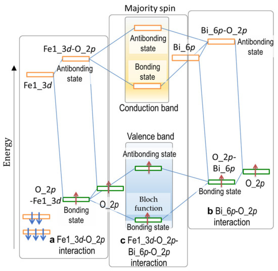 Orbital interactions delivering the Bloch function of the majoring spin (↑) band shown in Figure 4 of the rhombohedral BiFeO3 (x = 0): (a) Fe1_3d–O_2p mixing leading to a bonding state in the valence band and an antibonding state in the conduction band; (b) Bi_6p–O_2p mixing resulting in a low-lying bonding state and a high-lying antibonding state; and (c) hybridization between Fe1_3d–O_2p and Bi_6p–O_2p leading to the Bloch function at a deep level in the valence band.