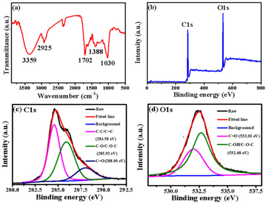 (a) FT-IR spectrum; (b) XPS full spectrum; peak fitting graphs of C1s (c) and O1s (d).
