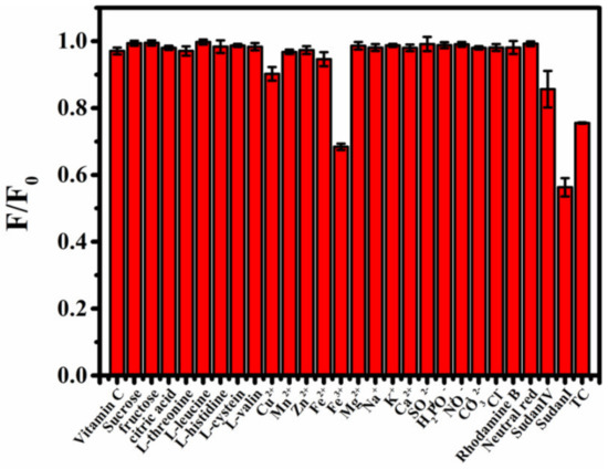 To explore the application of B-CDs in food safety testing, selective experiments were performed in view of the possible presence of substances in ketchup, palm oil and honey samples. As shown in Figure 5, vitamin C, sucrose, citric acid, five kinds of amino acids (L-threonine, L-leucine, L-histidine, L-cysteine and L-valine ), seven kinds of anions (Cu2+, Mn2+, Zn2+, Fe2+, Na+, K+ and Ca2+), four kinds of cations (SO42−, H2PO4−, NO3− and CO32−), rhodamine b and neutral red have little effect on the fluorescence intensity of B-CDs. However, Sudan I, Sudan IV, TC and Fe3+ produced strong quenching responses to the fluorescence intensity of B-CDs. Here, the concentrations of Sudan dyes and TC are 40 µM, and the concentrations of other compounds or ions are 600 µM. It indicated that B-CDs have good selectivity and other substances or ions except for Fe3+ do not interfere with the detection of Sudan I, Sudan IV and TC. The interference of Fe3+ ions can be eliminated by reducing them to Fe2+ ions.