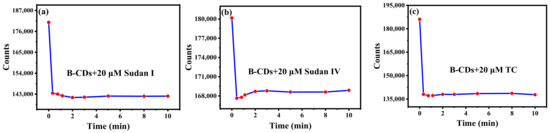 The incubation time of Sudan I, Sudan IV and TC for their reactions with B-CDs was explored. As shown in Figure 6a–c, 20 µM Sudan I, Sudan IV or TC was added to the B-CDs solution, and the fluorescence intensity of B-CDs was rapidly quenched within 1 min for Sudan I and Sudan IV and 20 s for TC, respectively. Subsequently, when the incubation time was 2 min for Sudan I and Sudan IV and 20 s for TC, the fluorescence intensity of the mixed solution tended to be stable and remained basically unchanged within 10 min. It indicated that B-CDs could rapidly, efficiently and stably detect Sudan I, Sudan IV and TC.