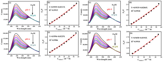 Fluorescence titration curves of Sudan I at different pH and their corresponding linear curves: (a,b) pH = 3, (c,d) pH = 5, (e,f) pH = 6 and (g,h) pH = 7 (F0 and F are the fluorescence intensities of B-CDs without and after adding Sudan I).