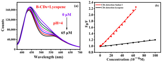 (a) Effect of different concentrations of lycopene on the fluorescence intensity of B-CDs; (b) Stern–Volmer fitting plots of F0/F versus various concentrations of Sudan I and lycopene (F0 and F are the fluorescence intensities of B-CDs without and after adding Sudan I and lycopene).