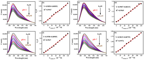 Fluorescence titration curves of Sudan IV at different pH and their corresponding linear curves: (a,b) pH = 3, (c,d) pH = 5, (e,f) pH = 6 and (g,h) pH = 7 (F0 and F are the fluorescence intensities of B-CDs without and after adding Sudan IV).