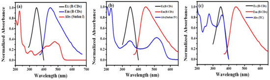 (a) The UV spectrum (red line) of Sudan I, the excitation spectrum (black line) and the emission spectrum (blue line) of B-CDs. (b) The UV spectrum (blue line) of Sudan IV, the excitation spectrum (black line) and the emission spectrum (red line) of B-CDs. (c) The UV spectrum (blue line) of TC, the excitation spectrum (black line) and the emission spectrum (red line) of B-CDs.
