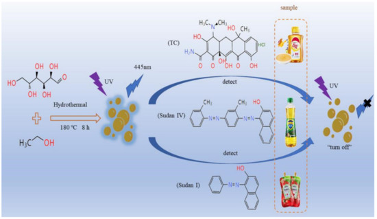 In summary, the carbon dots prepared by glucose were used for the determination of Sudan I, Sudan IV and TC in food, as shown in Scheme 1.