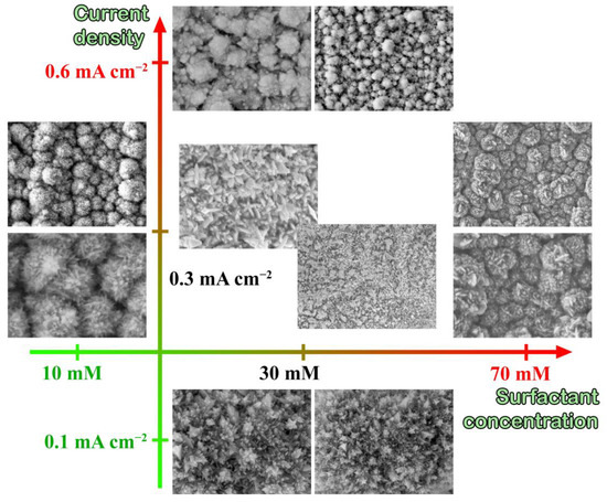 Nowadays, the nanotechnology field has significantly strengthened its position in many branches of human activity [1,2,3,4,5,6]. The design, development, and study of nanostructures attract the great attention of scientists all around the world because of the wide range of nanoparticle applications. Such studies are significantly dependent on the search for new stable and reproducible methods for obtaining nanoparticles with required parameters. For example, T. Takai et al. [7] have investigated the nanoparticles microwave synthesis implementation by the addition of surfactant. This method has allowed stabilization of synthesis via the synergistic effect of two-stage microwave treatment and a surfactant presence. In turn, S.S. Chan et al. [8] carried out microalgae-mediated nanoparticle synthesis. The method has proved to be quite stable and reduced the number of harsh chemicals involved in the synthesis. However, electrolytic deposition is the most interesting and promising method from the whole variety of known synthesis strategies [9,10,11,12]. The essence of the electrolytic deposition method is to create or modify particles on the electrode surface in a reaction cell containing a growth solution, where a potential or current causes the particle’s growth. The fundamental processes underlying the deposition reaction have been studied from different sides, such as kinetic, mechanistic, thermodynamic, and elastic continuum, each of which covers different aspects of the problem. However, a core understanding of the deposition process can be gained from the resulting coating morphology analysis. The morphology of a coating formed in a solid matrix is determined by many factors, among which the most significant consist of interfacial energy, strain energy, and deposition temperature. Many articles [13,14,15,16,17] confirm the presence of structural sensitivity in a variety of nanomaterials. This means that the size, shape, spatial distribution, and composition of nanoparticles, especially noble metal ones, are key parameters for tuning their activity and reactivity [18,19,20,21,22].