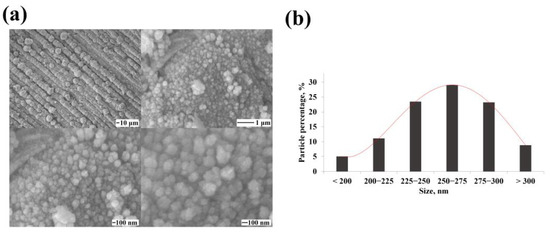 The classical methods of electrolytic deposition synthesis allow obtaining spherical particles of an energetically favorable configuration. Figure 2a shows SEM images of classical particles synthesized by electrochemical deposition. On average, 52.5% of the synthesized nanoparticles were the size of 225–275 nm according to the particle size distribution diagram (Figure 2b).