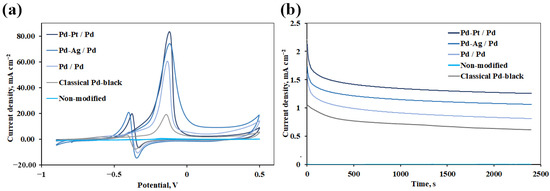 The catalysts synthesized on the surface of the Pd electrode had a sufficiently high activity and demonstrated the following peak current densities: for Pd-Pt/Pd—up to 83.51 mA cm−2, for Pd-Ag/Pd—up to 73.62 mA cm−2 and for Pd/Pd—up to 60.39 mA cm−2. The classical Pdblack/Pd particles had a significantly lower activity of 18.94 mA cm−2. Such an increase in the catalytic activity of bimetallic catalysts most likely may be due to the synergistic effect of the secondary metal (silver or platinum), which also inhibits the poisoning of catalyst active sites more efficiently than the monometal [48,49]. In addition, the initial potential of the Pd-Pt/Pd (up to −0.26 V) catalyst is more negative than for Pd-Ag/Pd (up to −0.25 V), Pd/Pd (up to −0.24 V) and Pdblack/Pd (−0.23 V). A more negative shift for the initial potential indicates that methanol can be easily oxidized and CO intermediates forming during methanol oxidation can be easily removed [50]. An initial potential with a more positive shift indicates less adsorption of methanol on the catalyst surface due to highly adsorbed carbonaceous species, which in turn leads to a decrease in the current response at a certain potential.
