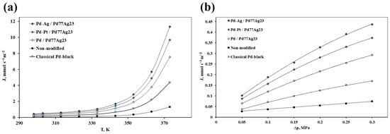(a) Temperature dependence of the hydrogen flux through membranes modified with the developed mono- and bimetallic nanoparticles at gauge pressure of 0.3 MPa; (b) Gauge pressure dependence of the hydrogen flux through membranes modified with the developed mono- and bimetallic nanoparticles at a temperature of 25 °C.