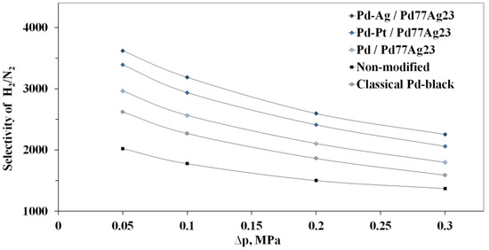 The membrane selectivity was determined as the ratio of hydrogen to nitrogen fluxes. The selectivity values were evaluated through gauge pressure dependence of the developed membrane samples (Figure 8). Obviously, the nitrogen flux increased with a pressure increase. Nevertheless, the hydrogen flux increased more, which, in turn, showed sufficiently high selectivity with its slight decrease because of the pressure gradient. Thus, the obtained selectivity values for each of the developed membranes at a pressure of 0.3 MPa were the following: for Pd-Ag/Pd77Ag23—up to 2254, for Pd-Pt/Pd77Ag23—up to 2058, for Pd/Pd77Ag23—up to 1798. The Pdblack/Pd77Ag23 membrane modified with classical particles demonstrated a slightly lower selectivity of 1591. The non-coated Pd77Ag23 membrane had the lowest selectivity of 1264. The difference in selectivities of the developed coated and non-coated membranes was up to 1.6 times. Most probably, a permeate flux significant increase, described in previous experiments on modified membranes’ hydrogen permeability, caused such high selectivity value. No hysteresis was observed with a pressure decrease, which indicates the developed membranes’ mechanical stability to high-pressure gradients.