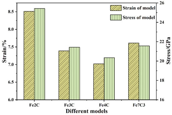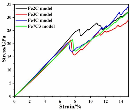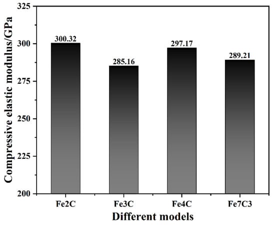By fitting the slope of the stress–strain curve of the ferrite–carbide models in the elastic stage, the compressive elastic modulus of each model was obtained, as shown in Figure 3. For all ferrite–carbide composite models, the type of carbide had an insignificant effect on compressive elastic modulus values. The highest compressive elastic modulus value was 300.32 GPa and was obtained for the Fe2C model, while the lowest compressive elastic modulus value was 285.16 GPa, obtained for the Fe3C model. The maximum difference in compressive elastic modulus was 5.32%. The bond energy was the main factor affecting the Young’s modulus values, with a greater bond energy resulting in a greater Young’s modulus value [33]. Thus, based on the total energy of the ferrite–carbide composite systems, the mean bond energy of each ferrite–carbide composite model was calculated. The results showed that the mean bond energy of the Fe2C model, Fe3C model, Fe4C model and Fe7C3 model was −5.134 eV/atom, −4.822 eV/atom, −5.099 eV/atom, and −4.896 eV/atom, respevtively. In general, the lower the bond energy was, the more stable the specimen was. There was a good correspondence between the bond energy and compressive elastic modulus.