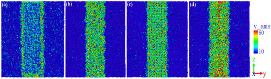 MD simulations were performed using the large-scale atomic/molecular massively parallel simulator (LAMMPS) package [18,19]. As shown in Figure 1, in the y direction, the initial model consisted of ferrite and various types of carbide “sandwiched” together. In the z direction, the initial model was divided into three zones: fixed layers, Newtonian regions, and loading layers. The total length along the x and z axis was 151.315 Å and 199.85 Å, respectively. The thickness ratio of ferrite and carbide on the y axis was approximately 1:1. To ensure a perfect lattice of carbides on the y axis, the thickness of carbides on the y axis was slightly different. The total length along the y axis was 158.746–166.285 Å. There were 454,817–502,120 atoms in the multilayer ferrite–carbide system. For convenience during analysis, the models were named after the carbide formula that constituted the model, namely, the Fe2C model, Fe3C model, Fe4C model, and Fe7C3 model.