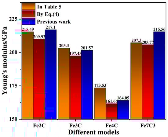 where and are the elastic modulus and volume of the individual lamellar, respectively. This formulation shows that when the ratio of ferrite and carbide is constant, the effective elastic modulus is also constant, regardless of the thickness of the carbide. Therefore, the Young’s modulus of a single crystal of ferrite and carbide was calculated to verify the reliability of the calculated results and the results are shown in Figure 6. From Figure 6, it can be seen that the Young’s moduli obtained by the fitting of the three methods were relatively similar, and the largest error was that the Young’s modulus of the Fe4C model was 7.34%. This result showed the reliability of the calculated results in this work. The Young’s modulus results show that the type of carbide was the main factor determining the elastic constant of the ferrite–carbide model when the thickness of the carbide was constant. This was consistent with the results of the analysis in the previous section.