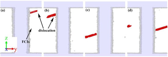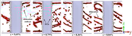 To better understand the type of carbide in the microstructural evolution, the evolution of dislocation nucleation was first monitored, and some significant nucleation configurations were carefully investigated. To facilitate the observation of defects inside the model, the atomic configuration of the model under a certain strain after the yield point was selected to monitor the model, and the results are shown in Figure 7. For the Fe2C and Fe3C models, the initial dislocations were formed in the upper zone of the model, while the initial dislocations of the Fe4C and Fe7C3 models were in the central zone. Although the initial dislocation of the ferrite–carbide models was on a different side to the FCIs, given the model symmetry, it is not discussed in this work. From Figure 7, it is worth noting that, although dislocation embryos were formed on the FCIs, the location of the dislocation embryos was significantly different. The initial dislocations formed on the FCIs and then expanded into the ferrite. It can be noted that the dislocation nucleation formed not only on the FCIs, but also in the ferrite, as shown in Figure 7d.