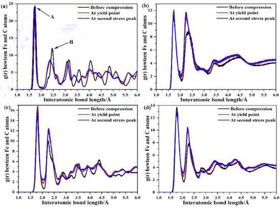where N is the total number of atoms (in this work, N = 200), ρ is the density of the system, δ is the Kronecker constant, and is the distance between atoms i and j. In the past, the RDF has been used to indicate structural transformations during contact loading [15,41]. Thus, the RDF was used to monitor the interatomic bond length between Fe and C atoms of carbides in this work. The results of carbides during relaxation, at the yield point and at the second stress peak were compared in the graphs shown in Figure 9. All carbides exhibited two obvious crystalline peaks (A and B), as shown in Figure 9, and the results of the interatomic bond length at the two peaks are shown in Table 7. It can be seen from Table 7 and Figure 9a that, before compression, Fe2C exhibited a crystalline peak at an interatomic bond length of 1.7385 Å, and a corresponding second peak at 2.455 Å. At the yield point and second stress peak, the first peak (A) did not show even a slight change. However, the second peak (B) showed a noticeable change in the count of the number of atoms. It is worth noting that, unlike other carbides, the count of the number of atoms at B decreased for Fe2C, while the count of Fe3C, Fe4C, and Fe7C3 increased, as shown in Figure 9. Compared to Figure 9, the pattern of the high order peaks of Fe2C and Fe4C became disordered, but that of Fe3C and Fe7C3 remained relatively orderly. This phenomenon was related to the density of carbides, as shown in Table 6, and the density of Fe3C and Fe7C3 was greater than that of Fe2C and Fe4C.