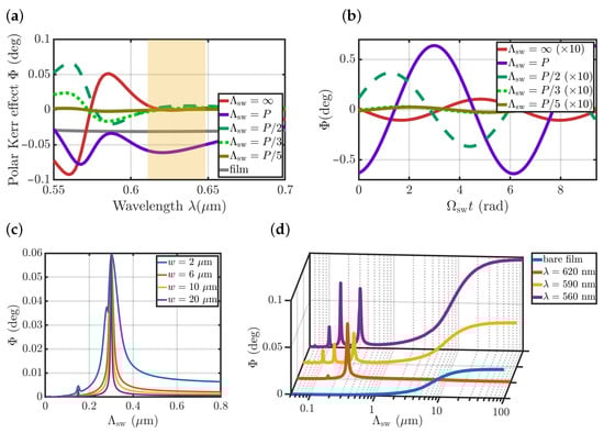 The total polar Kerr effect significantly depends on both the light and the spin-wave wavelength, as shown in Figure 3a. Furthermore, the value and sign of the polar Kerr effect depend on the phase of the spin wave as shown in Figure 3b as the spin wave component changes in each point of the structure . The values of these phases were chosen to provide maximal polar Kerr effect for each shown in Figure 3a.