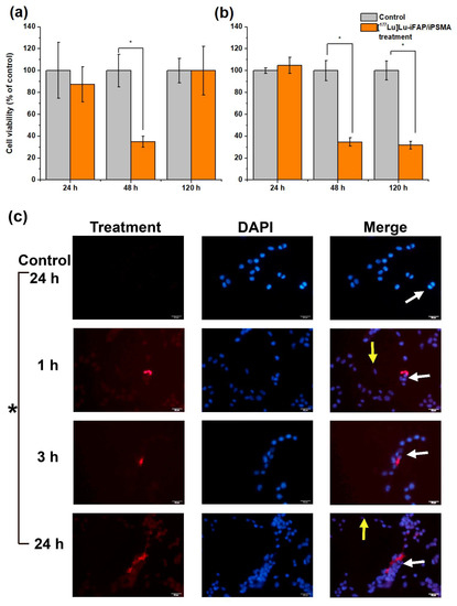 Cell viability of (a) U-937 macrophages and (b) HCT116 colorectal cancer cells exposed to [177Lu]Lu−iFAP/iPSMA nanoparticles for 24, 48, and 120 h (orange bar). Untreated cells were considered the control group (gray bar). (c) Representative fluorescence micrographs (400×) of a coculture of colorectal cancer cells and macrophage immune cells. The coculture was treated with [177Lu]Lu−iFAP/iPSMA nanoparticles for 1, 3, and 24 h. Control: cells without treatment at 24 h (red optical density of 10.95 ± 2.23). Red: emission of nanoparticles with an optical density of 29.57 ± 5.35, 34.17 ± 1.76, 79.85 ± 1.07 at 1, 3, and 24 h, respectively; Blue: DAPI (cell nuclei) and merged images. Yellow arrows point to colorectal cancer cells (tendency toward an oval shape). White arrows indicate macrophages (more prominent and more rounded than cancer cells). Of note is the significant presence of nanoparticle clusters associated with the cytoplasm of macrophages, whose accumulation increases markedly over time in parallel with macrophage proliferation. * Statistically significant difference (p < 0.05).