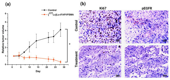 (a) Effect of [177Lu]Lu−iFAP/iPSMA treatment on HCT116 colorectal cancer xenograft tumors in nu/nu mice. Note a significant decrease in the relative tumor volume in mice treated with the nanoparticles compared to the control group. (b) Representative light micrographs (magnification of 400×) of immunohistochemical staining (dark brown color) for cell proliferation markers Ki67 and pEGFR in colorectal cancer xenograft tumors. Note the significant effect of [177Lu]Lu−iFAP/iPSMA on the decrease of tumor cell proliferation with regard to the control group. * Statistically significant difference (p < 0.05).